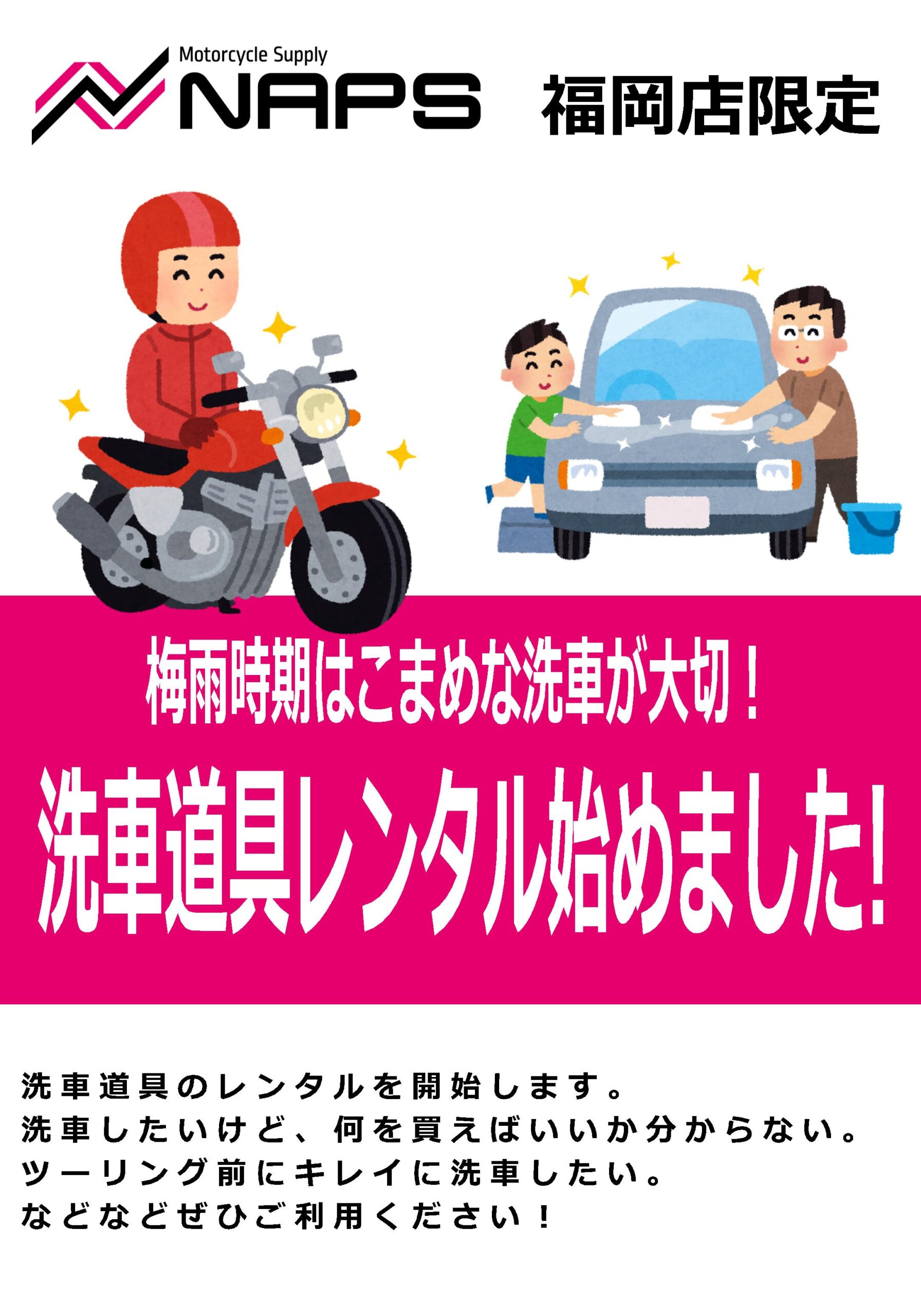 ナップス福岡店では、洗車道具のレンタルを開始します。 洗車したいけど、何を買えばいいかわからない。 ツーリング前にキレイに洗車したい。 などなどぜひご利用ください!