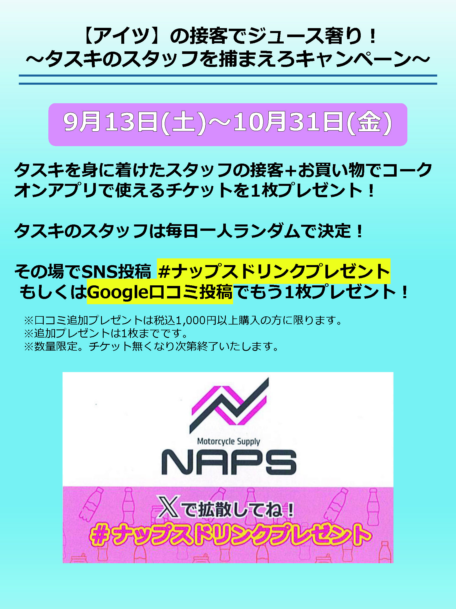 その場でSNS投稿#ナップスドリンクプレゼント、もしくはGoogle⼝コミ投稿でもう1枚プレゼント︕