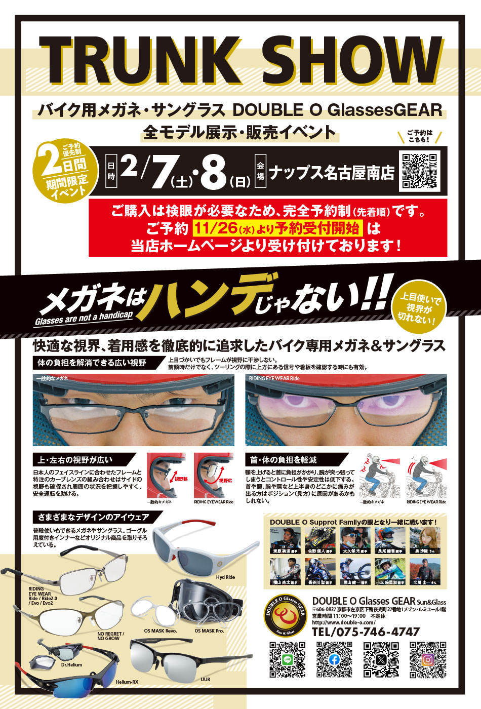 オートバイ専用度付メガネをリリースしているダブルオーグラスギアのスタッフが、「TRUNK SHOW / トランクショー」イベントを開催!