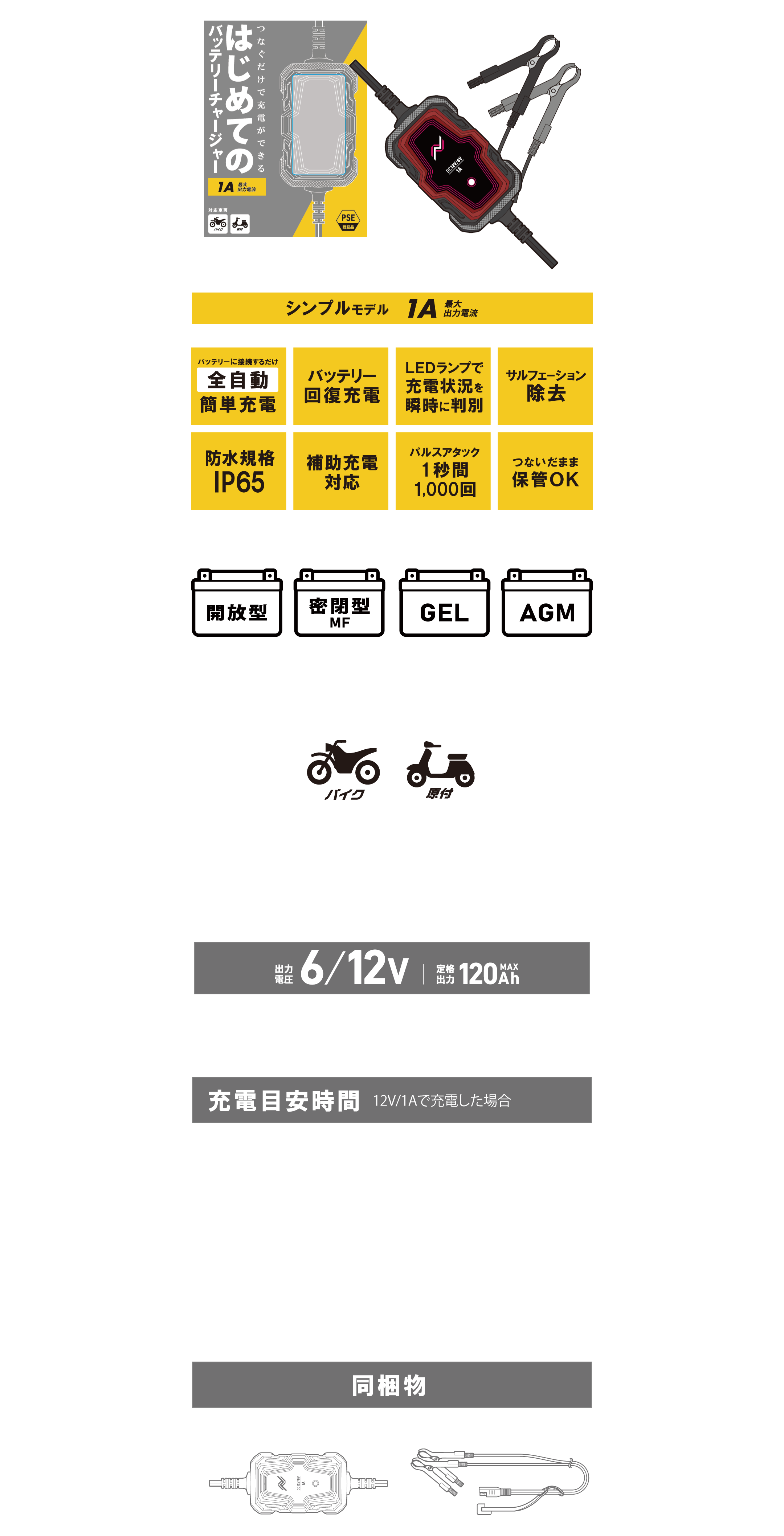 適合バッテリー:STD(6V・12V)/GEL/AGM