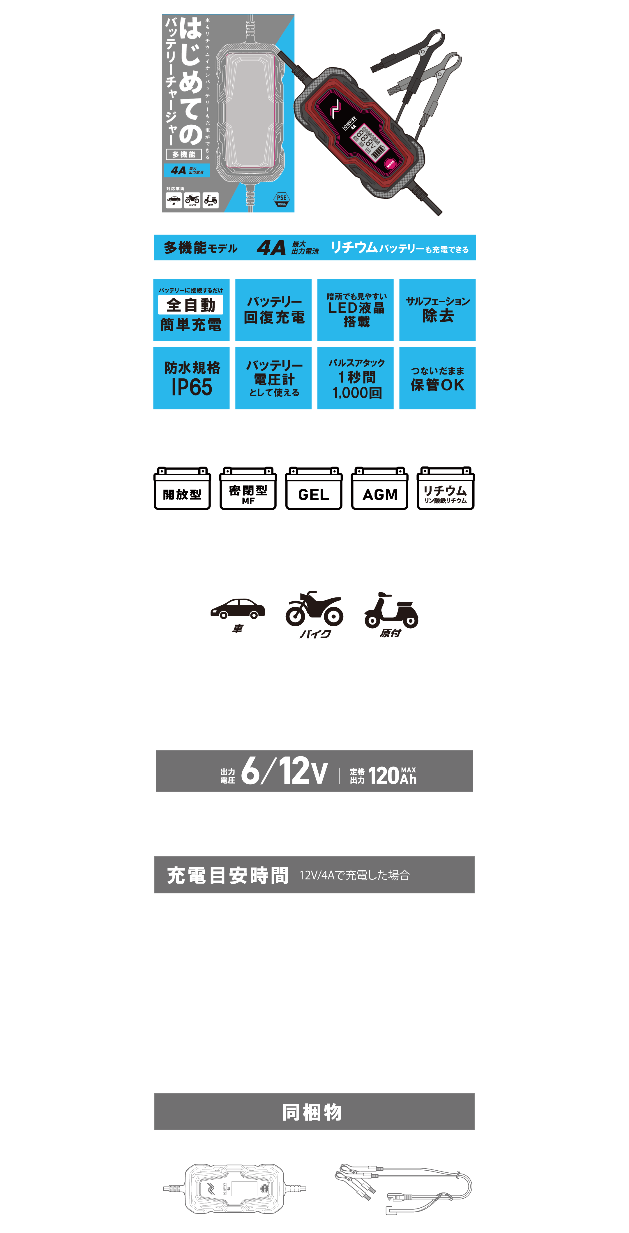 適合バッテリー:STD(6V・12V)/GEL/AGM/12V LFP(リン酸鉄リチウムのみ)