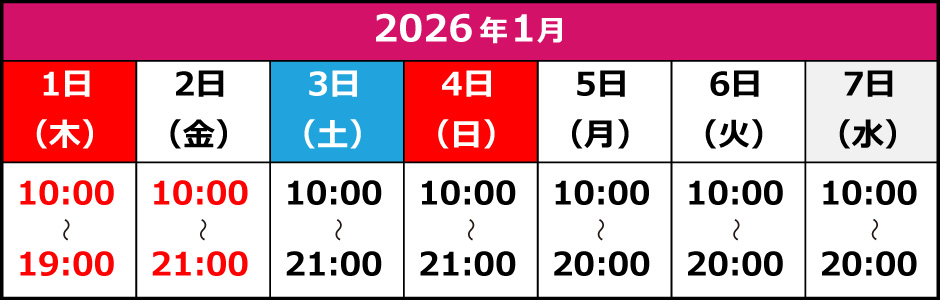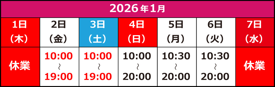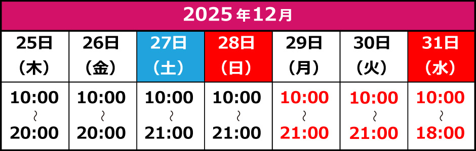 休業日:2025年12月30日(火)から2026年1月4日(日)まで