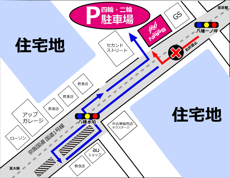 店舗は幹線道路(京阪道路 国道1号線)に面しておりますが、少し道を入ると近隣には住宅街がございます。当店へご来店の際、当店からお帰りの際は近隣住宅街を避けてご通行いただきますようお願いいたします。