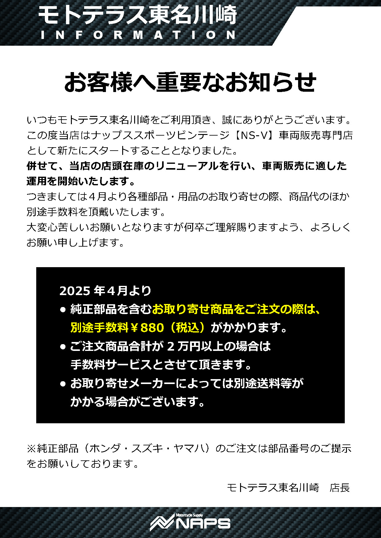 いつもモトテラス東名川崎をご利用頂き、誠にありがとうございます。