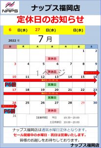 ナップス福岡店7月の定休日のお知らせです。